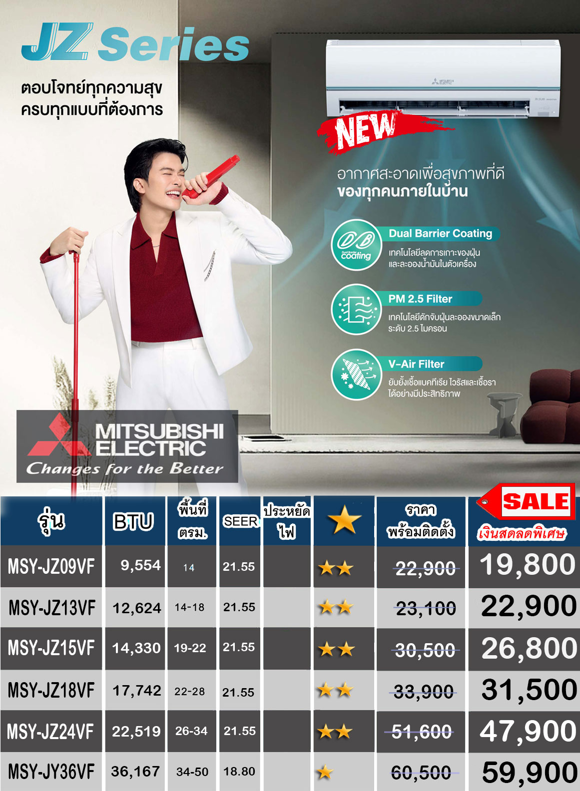 -มิตซูบิชิ มิเตอร์สลิม รุ่นใหม่ปี Standard Inverter JZ JY series-ประหยัดไฟเบอร์ 5 ระดับ 2 ดาว ขนาด 9000-36000BTU